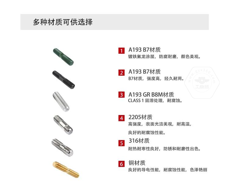 3、常用的雙頭螺柱材質(zhì):35鋼、45鋼、30CrMo35CrMo、42CrMo、25Cr2MoV、660、304、316、304L、316L、B7、B7M、B16、B8、B8M、A320L7、2205/2507等材質(zhì)。